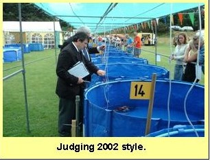 On arrival at the show follow the signs for "Benching". During benching we allow cars onto the show ground so drive up to the show ring and let an official know you have arrived. They will direct you to the 'Vat Allocation' official who will assign you a vat(s) and record your time of arrival. You will be asked to float your fish, in their bags for a period of time dependant on the local water temperature and weather. You may leave the vat at this time, but we ask you to return by the appointed 'floating' time and await the arrival of the benchers. The benching team may look formidable but it contains a number of people with specific jobs. You will be asked to undo your bags,(remember to save your elastic bands) and pass them accross to the bencher. He will then remove each fish individually and place it in an inspection/measuring bowl