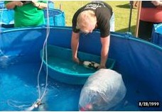 At the South East Section we like to say "Benching begins at home" and we say this to avoid dissapointment. The first thing any would be exhibitor has to do is 'register'. This is done by contacting the Show Chairman and expressing an interest in showing. He will send you a 'Registration form' by post for you to complete and return. We ask you to guestimate the number and size of the fish you expect to bring, so we can advise you if we consider that the vat is overloaded. Our show vats are 2metres in circumference and hold 300 gallons. If you feel that you need more, there is no problem for us, just book another vat. We now charge £10 per vat, this covers the cost of the photographs, exhibition cards, mementoes and trophies.